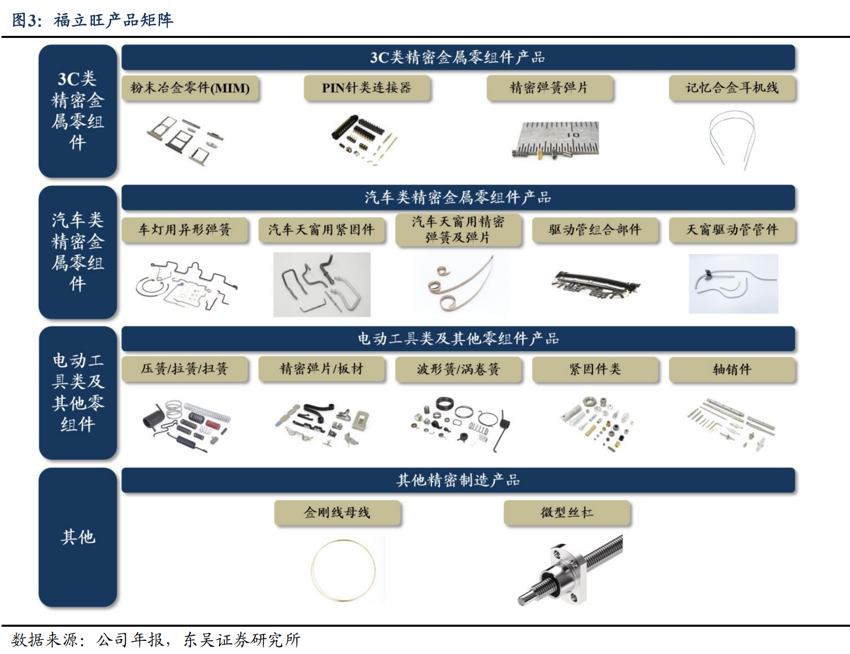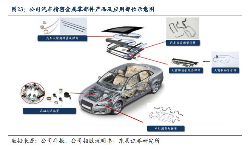 2)汽车:瞄准智能化升级机遇,推出车灯异形弹簧、天窗紧固件、精密弹簧及弹片、驱动管组部件,以“高可靠性+耐候性”突破奔驰、宝马供应链,实现汽车天窗部件进口替代,在高端车企配套体系建立技术壁垒。