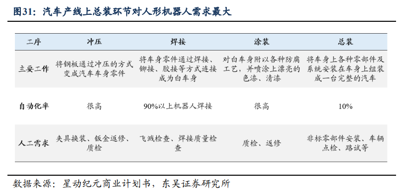 具体到汽车生产工序来看,人形机器人大概率应用于质检/汽车总装环节。在汽车生产的四大车间中,冲压、焊接以及涂装的自动化率都已非常高,仅有质检返修等工作需要依赖人工,而总装环节需要完成安装非标零部件、车辆点检、路试等工作,自动化率仅有 10%左右,对人工的依赖程度较高。此外,总装线布置密集度在所有车间中最高,装线之间通常仅相隔 2-3 米,布置体积更大、自动化程度更高的设备存在较大空间限制。因此,未来总装环节自动化率的进一步提升有赖于人形机器人的引入与落地。