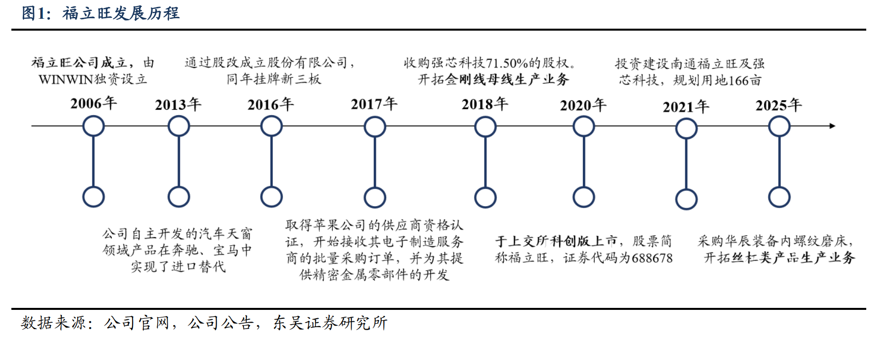 发展历程:2006 年外资独资启航,2013 年股改开启资本化进程;2016 年迎来关键节点,新三板挂牌同步,自主研发的汽车天窗部件突破奔驰、宝马供应链,实现进口替代,标志技术实力获国际车企认证。2017 年斩获北美大客户额供应商资质,切入消费电子精密件赛道,承接电子制造服务商批量订单,打开全球化增长通道;2018 年并购强芯科技 71.50%股权,横向拓展金刚线母线业务,完善新能源产业链布局。2020 年科创板上市(代码 688678)后,资本助力加速产能扩张:2021 年投建 166 亩南通生产基地,夯实规模化制造根基;2025 年战略采购人形机器人用磨床,正式切入丝杠类产品领域,开启第二增长曲线。