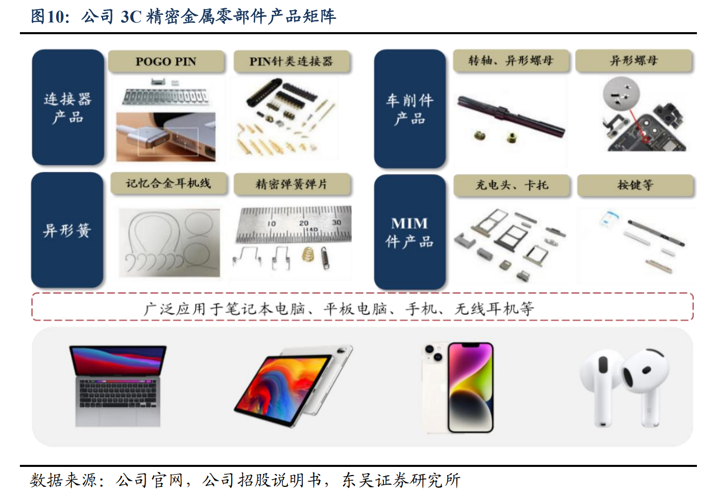 深耕精密制造主业,3C、汽车、电动工具多线协同增长。公司 3C 类精密金属零部件产品体系完善,广泛应用于笔记本电脑、平板电脑、手机及无线耳机等信息终端设备。公司主要产品包括 POGO PIN、PIN 针类连接器、记忆合金耳机线、卡簧及线簧等异型弹簧、转轴、异型螺母等车削件,以及充电头、卡托、按键等 MIM(金属粉末注射成型)件,覆盖连接器、弹性件、结构件多个品类,满足支撑、固定、信号传输、电磁屏蔽等不同应用场景需求。具体来看,耳机方面应用公司产品数量最多,亦是其主要的收入来源。凭借在材料成型、微小精密加工方面的技术积累,公司已形成涵盖多个环节的制造能力,不断优化产品设计和工艺,提升产品品质。