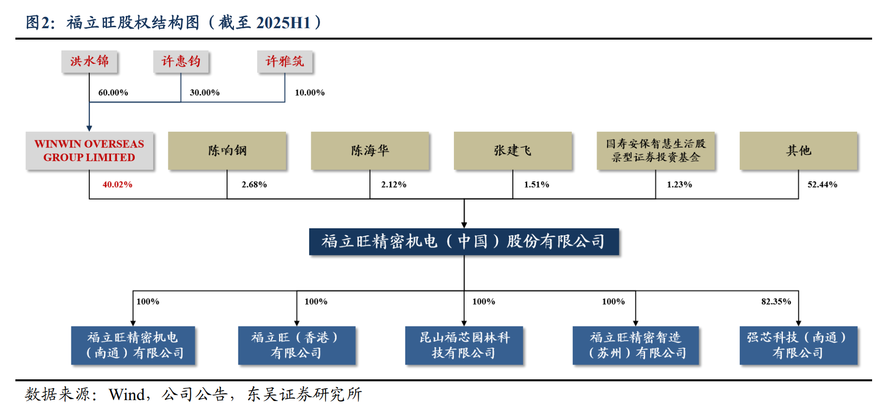 控股股东稳定,子公司多领域布局。公司股权架构稳定,截至 25H1,实控人洪水锦、许惠钧及许雅筑系家庭关系,通过 WINWIN OVERSEAS GROUP LIMITED 持有公司 40%股份。子公司方面,公司通过 100% 持股的南通福立旺、100%持股的苏州福立旺精密制造、82.35%控股的强芯科技 等,实现消费电子、汽车零部件、人形机器人及光伏的多领域布局。
