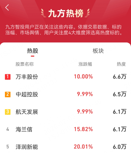 九方热榜:万丰股份,中超控股,航天发展,海兰信,泽润新能