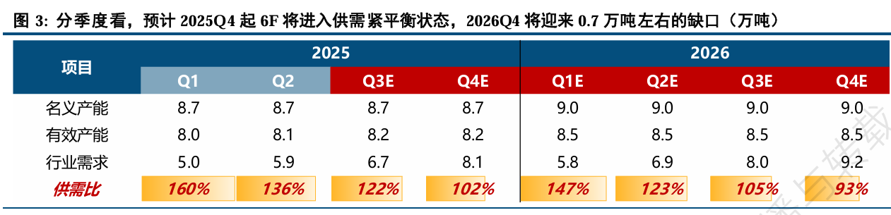 需求端,我们预计2025、2026年全球锂电需求为1873、2238GWh,对应电解液需求225、269万吨,6F需求25.6、29.7万吨。分季度来看,其中2025Q3、Q4的6F需求为6.7、8.1万吨。供给端,大部分6F企业2024年在已有扩产项目投产后,暂缓了未开工项目的扩建(因为长期的低价,全行业亏损)。我们预计2025、2026年全行业6F名义产能34.8、35.8万吨,有效产能32.4、34.0万吨。分季度来看,其中2025Q3、Q4的6F有效供给为8.2万吨。供需结合来看,我们预计2025Q3、Q4的6F供需比为122%、102%,Q4起6F将进入供需紧平衡状态。展望2026年,随着下半年进入旺季,我们预计2026Q3、Q4的6F供需比为105%、93%,Q4将迎来0.7万吨左右的缺口。天赐材料、石大胜华可能新扩的液体6F产能的释放,天际股份明年可能投产的1.5万吨新产能,以及多氟多暂时停产的阳泉、云南产能的复产,将成为决定供需的关键变量。