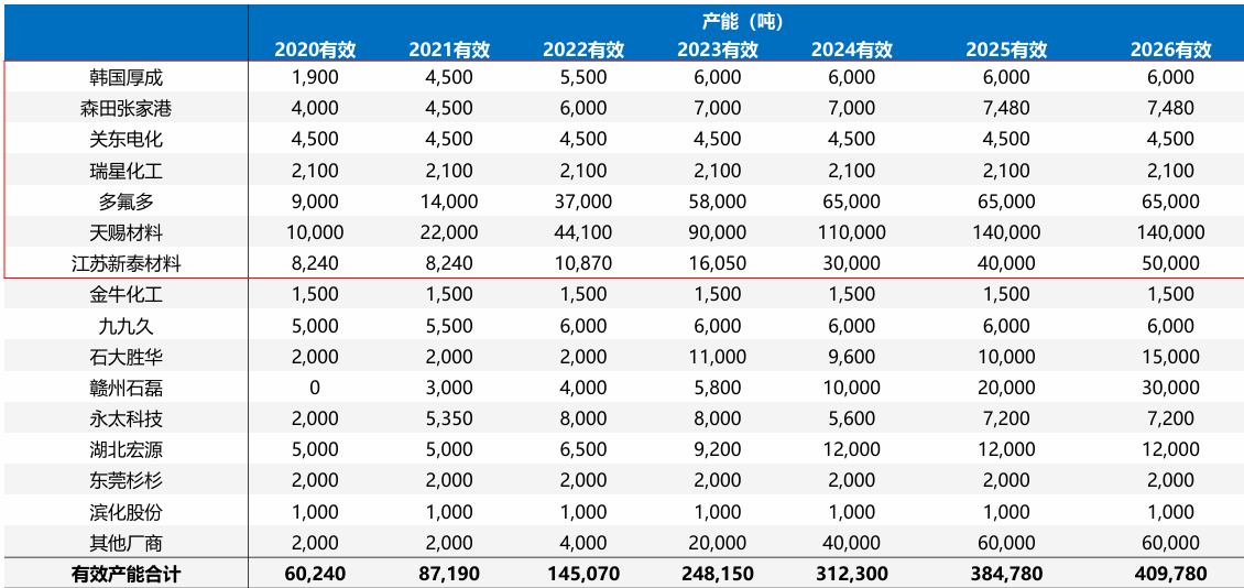 目前国家反内卷政策支持下,头部玩家挺价意愿强烈,25-26年除天际、石磊外,均无新增产能投产,行业供需拐点明确。天赐产能25、26年预计产能保持稳定,有3万吨产能随时可开,多氟多25、26年无新增产能,但有1万吨备用产能随时可开;天际当前满产,26H2年有1.5万新产能投产,石磊预计由2.5万吨扩产至3.6万吨,石大胜华有3万吨产能爬坡,其余厂商暂无扩产计算,且小厂由于成本较高陆续退出,我们预计头部市占率将继续提升。