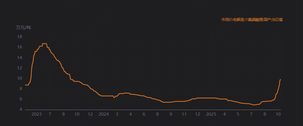 十一节后,六氟磷酸锂市场散单报价出现连续上涨,10月1日仅约6万元/吨,10月28日最新报价已达10万元/吨,涨幅超60%。短期来看,年末需求向上,头部企业挺价意愿强烈,六氟散单报价持续向上,同时六氟企业与下游客户重新商谈长协价格,长协价格跟随散单上涨,带动企业盈利向上。中期看,26年锂电行业需求仍有望维持20%+增长,2Q25后随需求增长,供给端增量有限,六氟有望开启新一轮涨价。