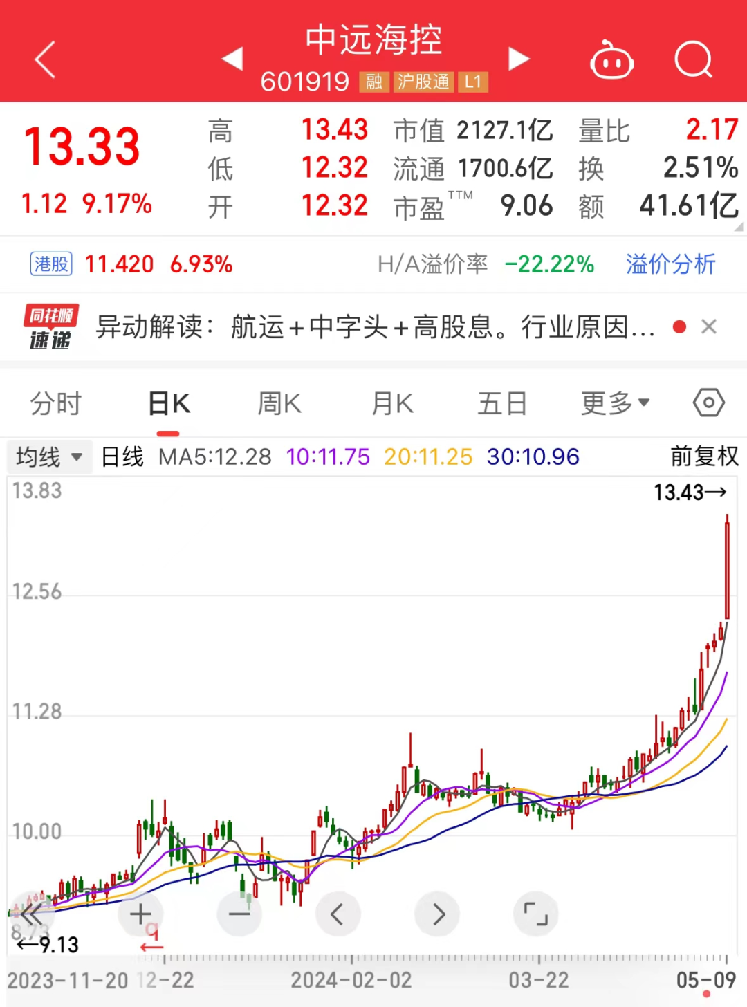 航运概念今日持续走强,凤凰航运、中远海发涨停;“周期之王”中远海控涨超9%,盘中一度触及涨停,成交额超41亿元,股价创2022年以来新高。
