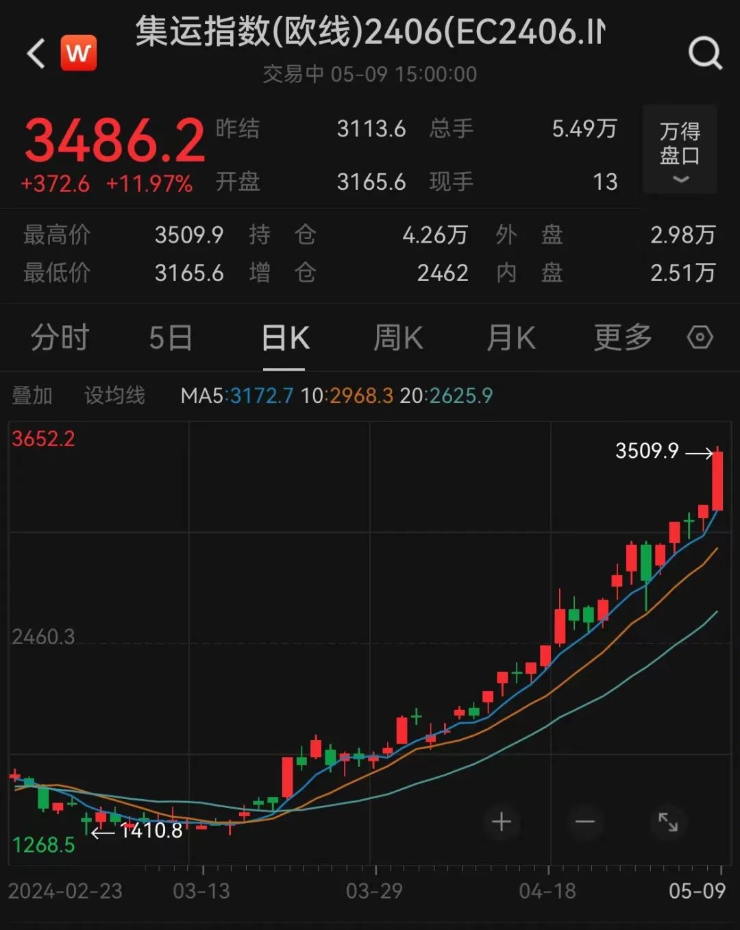 消息面上,国内集运指数(欧线)期货主力合约强势上涨近12%,最新报3486.2点,本月以来该合约累计上涨20.23%。