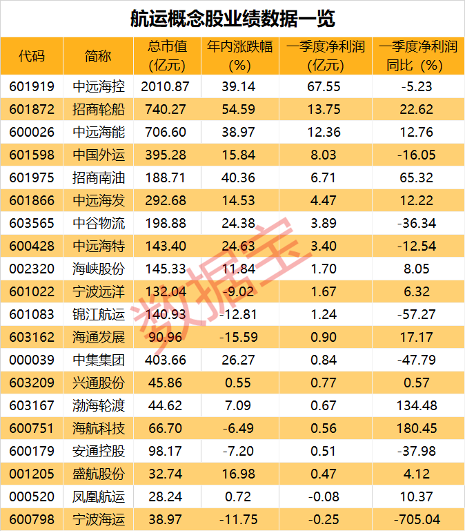 据证券时报·数据宝统计,A股中,航运概念股有20只,年内平均上涨12.65%,跑赢大盘;招商轮船、招商南油、中远海控、中远海能年内股价均上涨超30%。