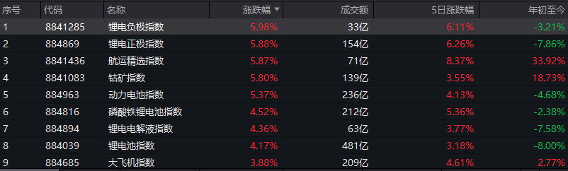概念指数涨幅居前板块多来自锂电池相关概念,天力锂能、合纵科技、湘潭电化、天际股份等10余股涨停。