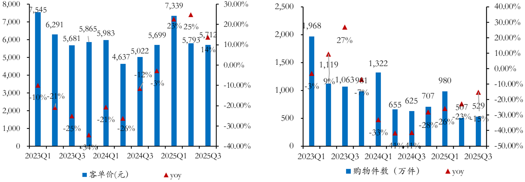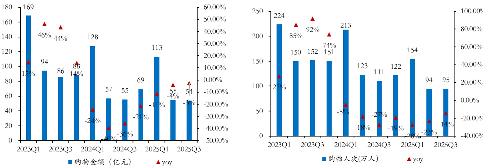 离岛免税销售金额同比降幅逐月收窄,中免海南销售复苏。2025Q1-Q3海口海关共监管离岛免税购物金额221.7亿元/-7.6%;免税购物人数 342.9 万人次/23.2%;免税购物件数2017 万件/-22.5%,客单价6465元/+20.3%;Q3 离岛免税销售降幅环比缩窄,9月销售额同增3.4%、为近18个月以来首次增速转正。
