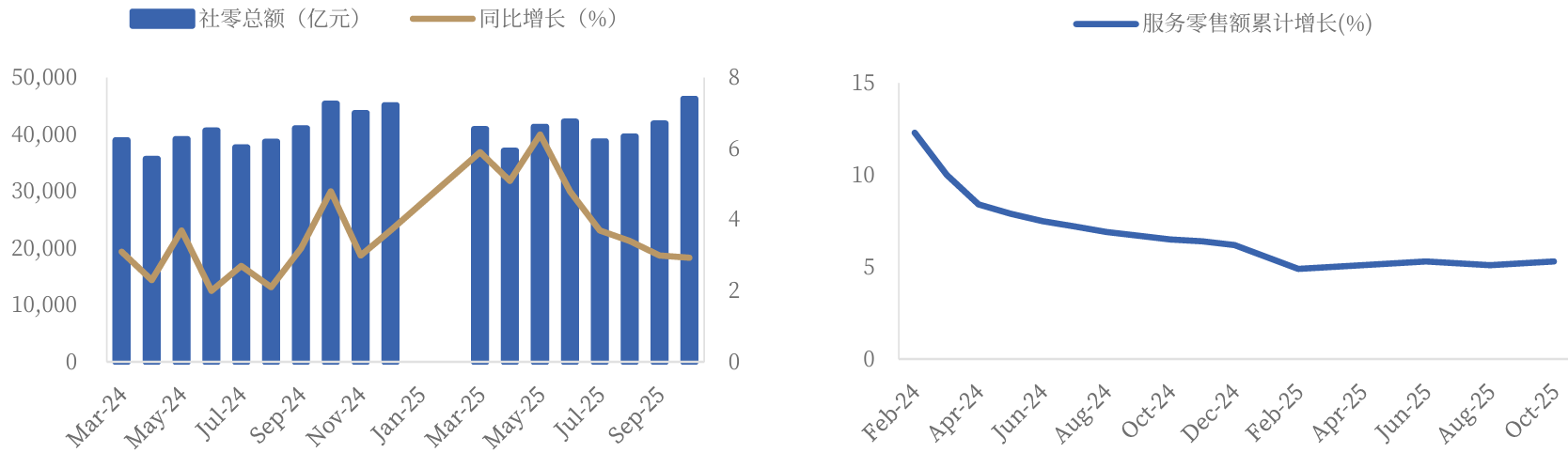 受整体宏观环境及政策变化影响,2025年社零总额增速呈现“前高后低”趋势,尤其当耐用品消费的刺激渐入尾声,商品零售与服务零售的剪刀差重新扩大,服务消费的韧性体现的更为明显。进入Q4,伴随酒店、机票等出行服务价格回升,服务零售增速已稳定于5.0%-5.3%区间。
