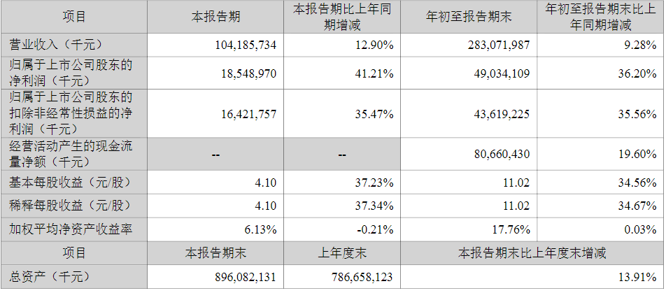 单三季度收入1041.86亿元,同比增长12.90%,环比增长10.62%;归母净利润185.49亿元,同比增长41.21%,环比增长12.26%;扣非净利润164亿元,同比增长35%,环比增长7%;毛利率、扣非净利率25.8%、16%,环比持平。
