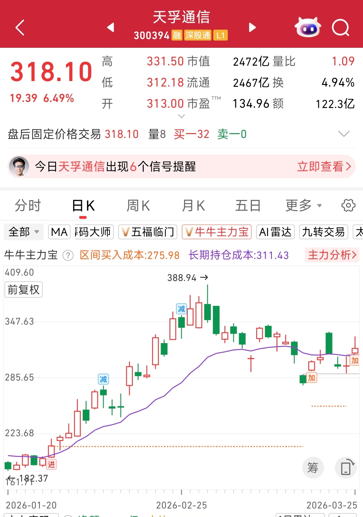 根据主力宝监控,光模块巨头天孚通信,在3月25日再次出现主力加仓信号,感兴趣的朋友可以自行跟踪判断。