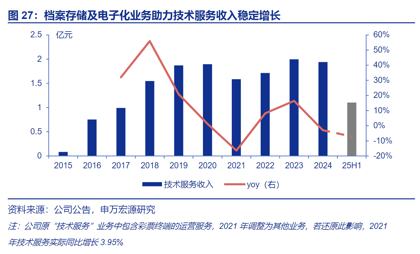 技术服务:多元化业务发展,档案存储及电子化业务受益行业渗透率提升,2025H1受到纸质票寄送业务萎缩的影响,2025H2 逐渐恢复。