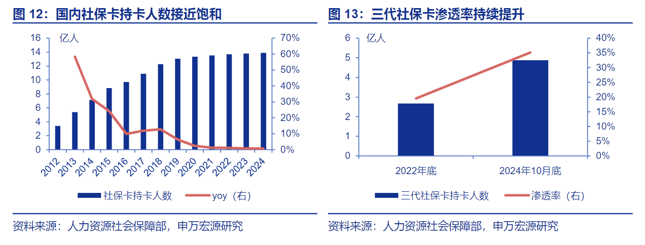 社保卡存量较为稳定,三代社保卡贡献换新需求。2011年7月人社部和央行联合发布《关于社会保障卡加载金融功能的通知》,决定在社保卡上加载金融功能。截至2024年底,国内社保卡持卡人数达到13.89亿人,覆盖98%以上人口,存量已趋于稳定。除正常的更换需求外,第三代社保卡于2017年开始技术验证,2020年全面启动推广,核心优势集中在功能拓展、安全性提升、便捷性优化三大维度,前两代社保卡核心功能集中于“社保业务办理”,第三代则实现“社保+金融+公共服务”多场景覆盖,真正落地“一卡通”,且具备非接触式交互、线上线下打通和跨区域通用等属性。22年底、24年10月底三代社保卡的持卡人数分别为2.67、4.87亿人,渗透率分别为19.5%、35.1%,未来有望持续提升。