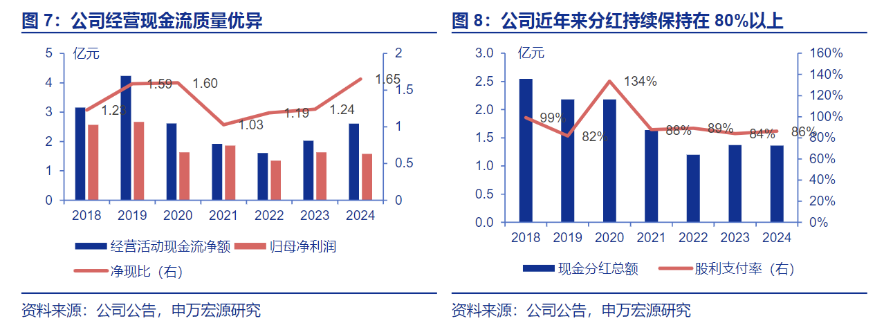 资产质量优异,高分红持续回报股东。公司资产结构健康,截至25H1末资产负债率为28.0%,账面净现金充裕。公司主要客户为银行、保险等金融企业客户,财政、税务等政府类客户,以及大型企业类客户,回款风险低,主业稳健发展背景下,公司不断提升生产运营效率,加强运营资金管控,净现比持续保持高位。优异现金流支撑下,公司延续高分红策略,近年来分红率保持在80%以上,充分回报股东。