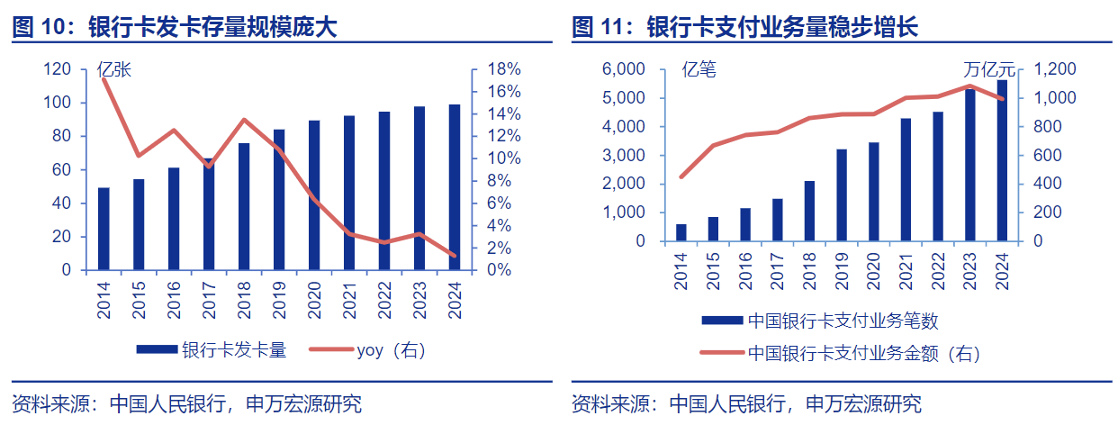 银行卡存在较大规模换新需求,此外应用场景拓展贡献增量。根据中国人民银行要求,从2013年1月1日起,全国性商业银行均要发行金融IC芯片卡,金融IC卡的更新换代进入实质性实施阶段,近年来银行卡资金交易规模不断扩大,截至2024年底,中国银行卡支付业务笔数、支付业务金额分别为5642亿笔、993万亿元,2014-2024年复合CAGR分别为25.2%、8.2%,助力银行卡等交易媒介稳定增长。此外,金融IC卡所具备的行业应用属性进一步拓展了借记卡和信用卡的使用场景和应用领域,为借记卡和信用卡市场增加了新的动力。2024年银行卡累计发卡量99.13亿张,同比增长1.3%,2014-2024年CAGR为7.2%,近年随着人均持卡量接近饱和(2024年底人均银行卡持有量7.04张),增量需求有所放缓,但随着产品迭代升级,庞大的存量市场持续贡献换新需求。