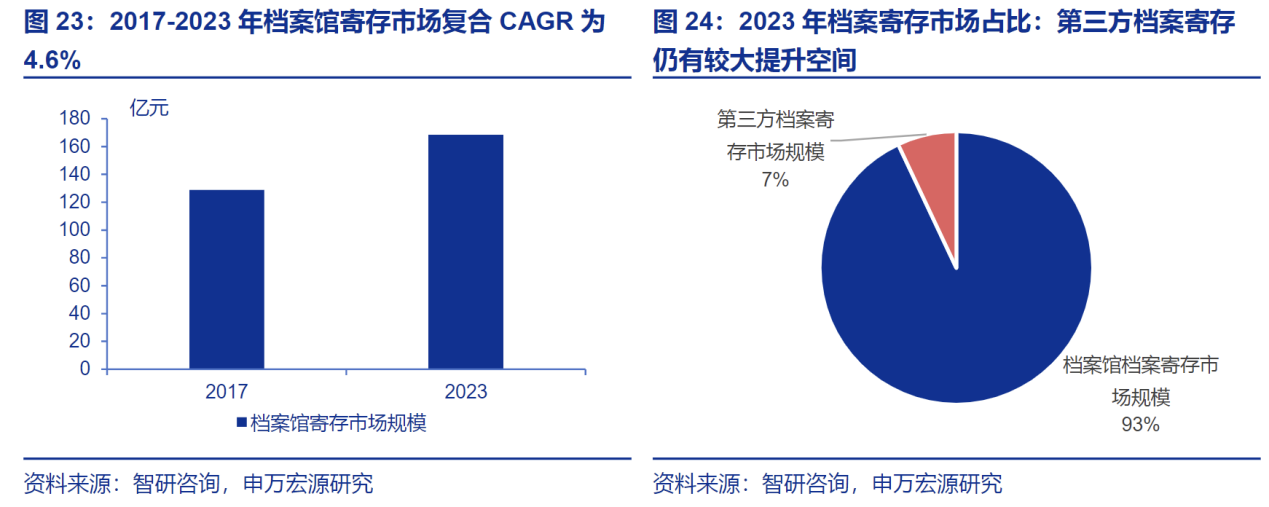 档案存储及电子化行业:第三方专业档案寄存市场渗透率仍有较大提升空间,2023年 仅占 7%。同时,档案数字化市场需求不断扩大,2023年 市场规模达 40亿元,2017-2023年 CAGR为 11.1%。