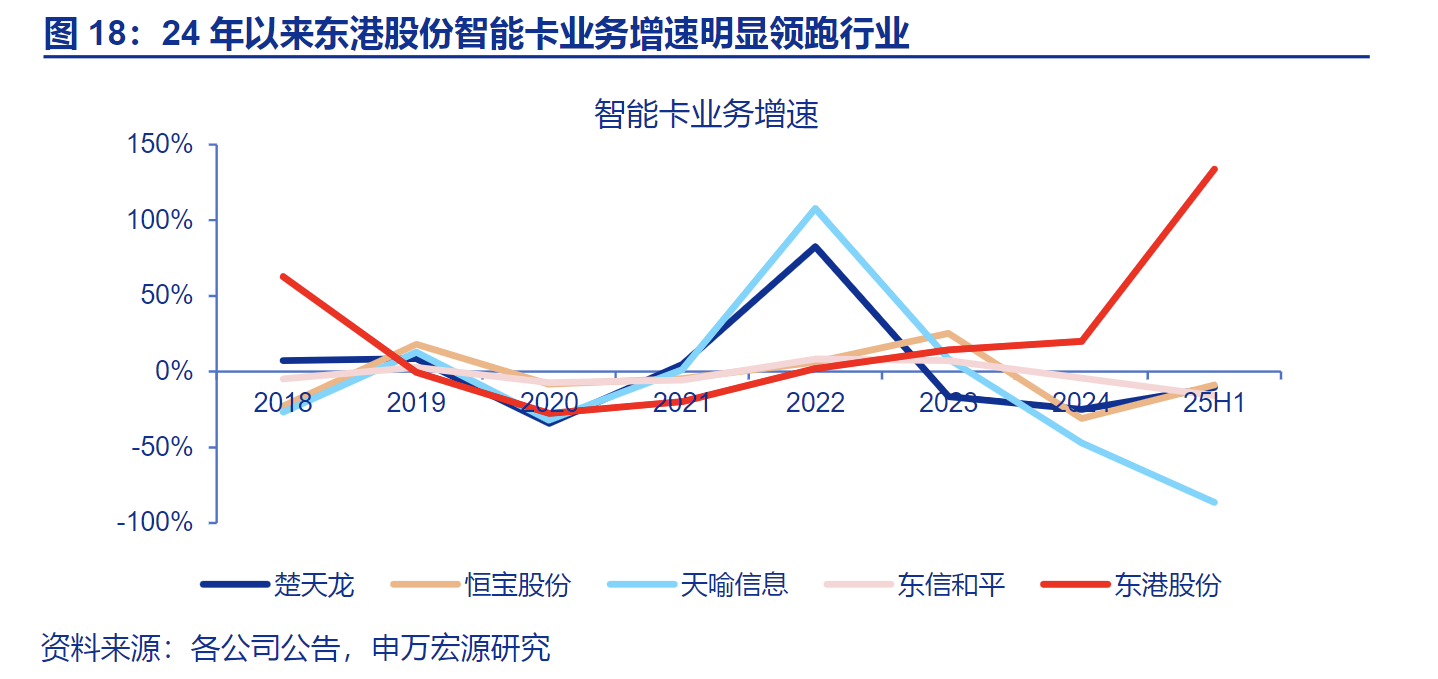 智能卡业务:主要竞争对手包括 楚天龙、恒宝股份、东信和平、天喻信息。与竞争对手相比,东港股份虽然收入体量尚有差距,但 增速遥遥领先。2025年上半年,公司覆合类业务收入同比增长 133.8%,而四家可比公司同期累计收入增速为 -29.7%。