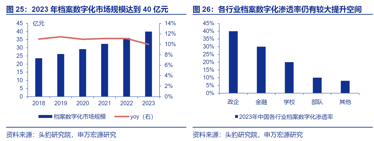 档案数字化、AI+档案或成未来新趋势。档案数字化是将传统的实体档案资料转换为电子形式的过程,旨在便于长期保存、快速检索和广泛共享,随着社会对信息资源需求的增长,档案数字化市场需求不断扩大。根据头豹研究院,2023 年国内档案数字化市场规模达到 40 亿元,2017-2023 年 CAGR 为 11.1%,2023 年政企、金融、学校、部队、其他行业的档案数字化渗透率分别为 40%、30%、20%、10%、8%,仍有较大提升空间。此外 AI技术的快速发展,有助于加速档案的数字化转型,AI+档案的应用场景包括档案开放审核、数字化成果处理、辅助档案整理、档案智能检索、辅助档案编研、声像档案处理、辅助接待利用和库房智能助手等诸多领域,大幅提升档案管理效率。