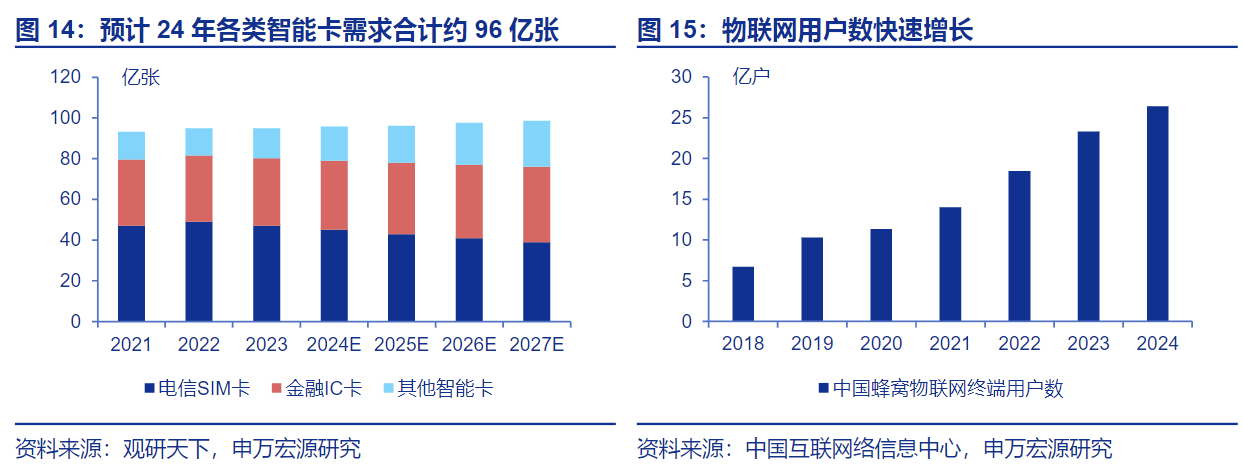 但智能卡电子化通常是依托实体卡进行应用拓展、延伸以满足特定人群在特定场景的便捷使用需求,是实体卡的有机补充;无卡化指不再依托实体智能卡作为媒介,通过生物识别等技术直接关联个人身份、数据信息,以实现智能卡的相关功能,但出于安全性、隐私性等考量,无卡化在金融、社保、通信等领域存在难以逾越的障碍。目前实体+电子智能卡协同发展的模式仍然为主流,支撑实体智能卡需求。根据观研天下,预计2024年全球智能卡总需求为95.8亿张,2021-2024年CAGR为0.9%,预计2024-2027年仍然保持1.0%的增速,其中电信SIM卡需求有所下降(受eSIM卡等影响),金融IC卡需求稳定增长,应用于ETC、物联网等领域的其他智能卡快速增长。