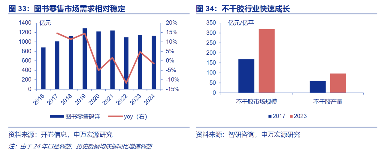 彩色印刷需求相对稳定,不干胶市场延续景气,支撑东港印刷主业企稳。彩印图书需求相对稳定,根据开卷信息,2024 年全国图书零售码洋 1129 亿元,同比下降 1.5%,2016-2024 年复合 CAGR 为 3.1%。不干胶标签具有自粘性、多样性、便捷性、可移除性、持久性等特点,广泛应用于商品包装、物流、办公管理等多个领域,在日化行业、医药行业、超市和物流行业等行业的需求不断增长。根据智研咨询,2023 年不干胶市场规模、产量分别为 319 亿元、97 亿平,2017-2023 年复合 CAGR 为 11.2%、8.9%,未来随着材料技术和印刷工艺的不断进步,不干胶标签将继续发展,提供更多功能性和个性化的解决方案,满足不同领域的需求。