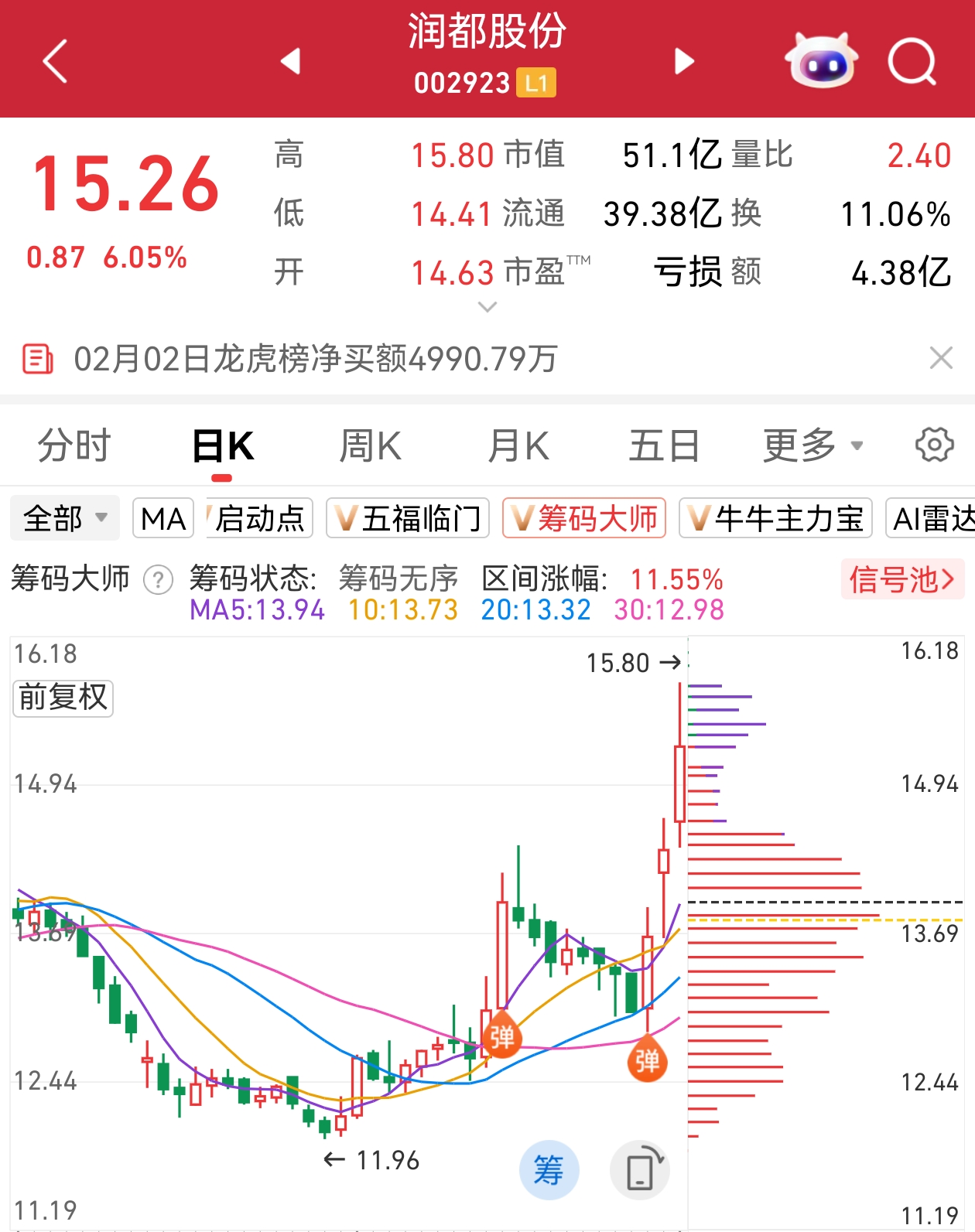 注:“筹码大师”显示,润都股份2026年1月29日出现“弹”信号!