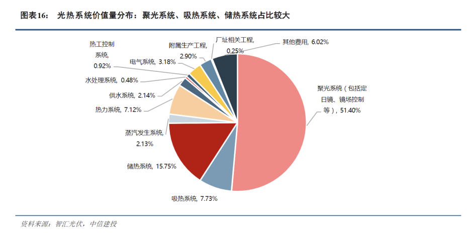 中国熔盐储能行业目前处于起步阶段,但近年来在“双碳”目标推动下发展迅速。目前已并网的项目包括首航节能敦煌100MW熔盐塔式光热电站、青海中控德令哈50MW熔盐塔式光热电站等。成本构成方面,以储热时长为12小时的100MW塔式光热电站成本为例,聚光系统占比最大,为51.4%,储热系统占比15.8%。聚光系统通常建设规模较大,投资成本高;储热系统是实现能量转换的核心环节,技术要求高。