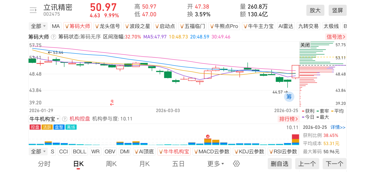 2)20260325-立讯精密-002475-【筹码大师】和【牛牛机构宝】-近期出现弹信号且底部量柱由绿转红