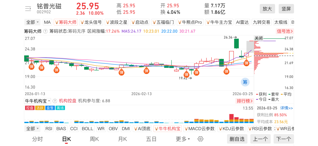1)20260325-铭普光磁-002902-【筹码大师】和【牛牛机构宝】-近期出现弹信号且底部量柱由绿转红