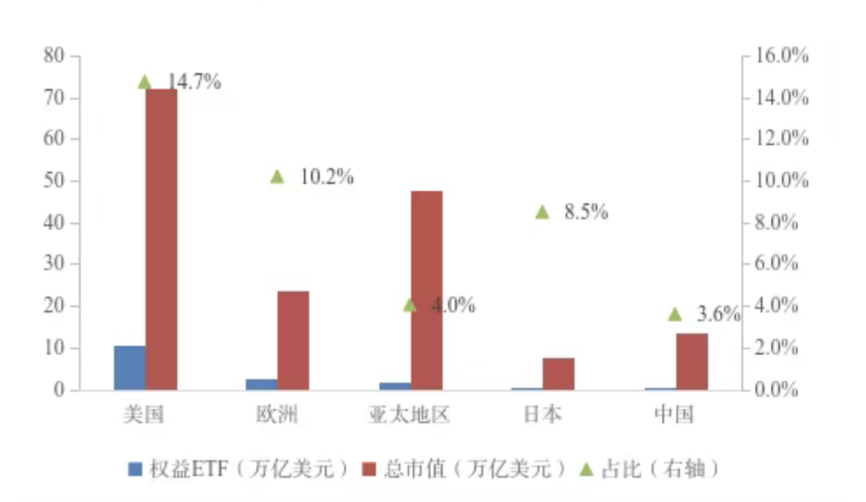 而去年美国ETF市场规模为13.5万亿美元,全球占比68%;欧洲市场规模约3.2万亿美元,全球占比约16%;亚太市场规模约2.4万亿美元,全球占比12%。