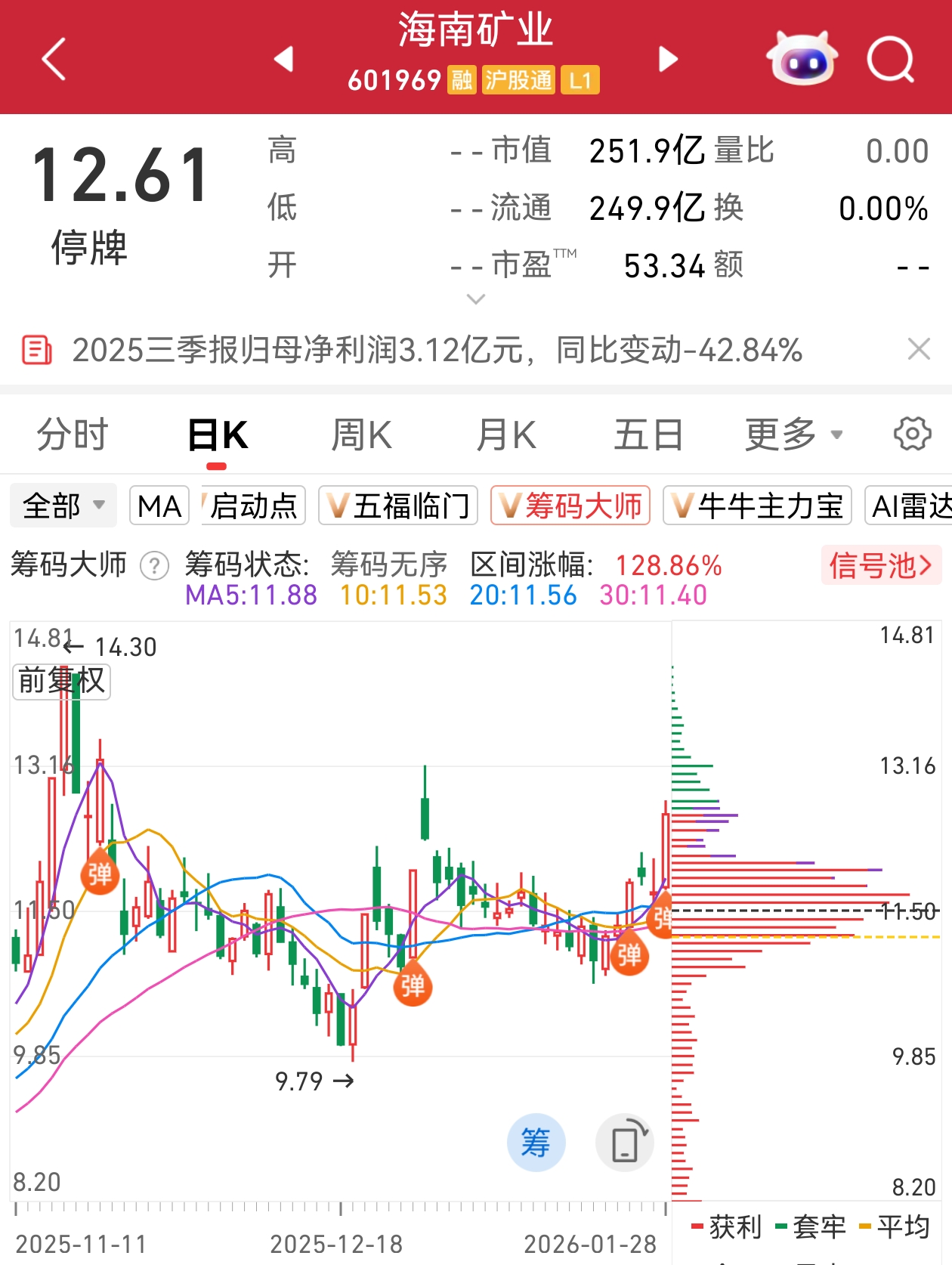 注:“筹码大师”显示,海南矿业在停牌之前的1月23日、1月28日连续出现“弹”信号!